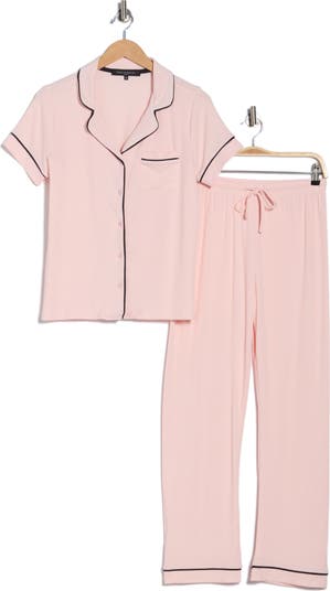 Elevate your bedtime routine with these tipped jersey pajamas that include a collared top, shorts and pants that easily mix and match for cute sleep combos.