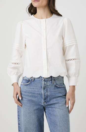 Breathable and accented with intricate broderie anglaise, this all-cotton button-up shirt serves sweetness with its puff sleeves and scalloped edges.