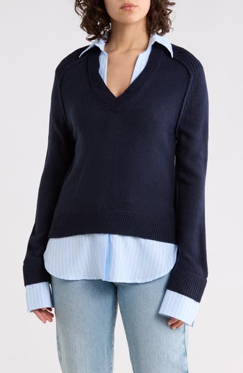Get a trendy layered look with this polished twofer top fashioned with a supersoft V-neck sweater contrasted by a crisp collar, cuffs and hem.