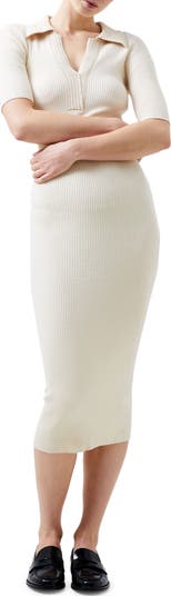 A ribbed knit adds texture to this slim-fitting sweater-dress designed with a jaunty collar and a midi length.