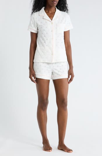 Drift off to dreamland or lounge in luxury with these cotton-blend eyelet pajamas featuring a collared short-sleeve top and matching shorts that feel soft against your skin.