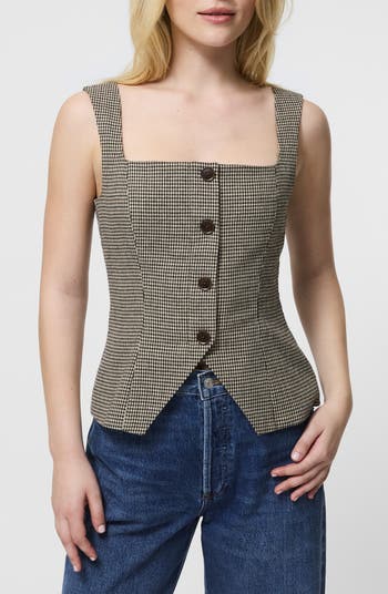 Mini houndstooth checks enhance the polish of this figure-skimming sleeveless top made with a sharp square neck and finished with a cutaway hem.
