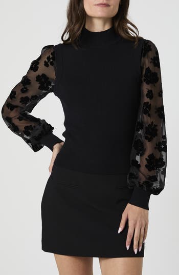 Sheer, burnout velvet sleeves add a touch of volume and charm to this curve-hugging ribbed sweater topped with a mock neckline.