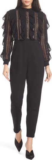 Cascading pleated ruffles flutter and sway from an openwork lace bodice that gives vintage romanticism to this stretch-jersey jumpsuit with clean tapered legs. The front of the bodice is lined with mesh for modesty, while a keyhole at the neck gives the look a sassy finish.