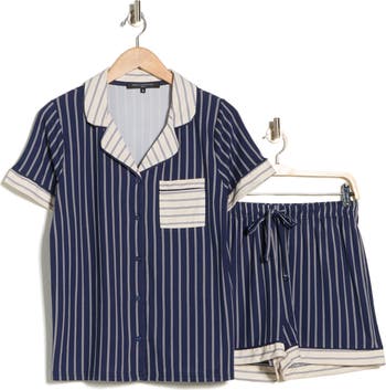 Drift off to dreamland or lounge in luxury with these striped pajamas featuring a collared short-sleeve top and matching shorts that feel soft against your skin.