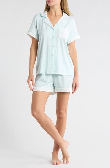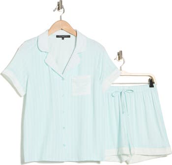Drift off to dreamland or lounge in luxury with these striped pajamas featuring a collared short-sleeve top and matching shorts that feel soft against your skin.