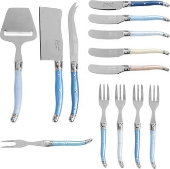 Three-rivet curved handles add traditional appeal to this 13-piece Laguiole charcuterie set. The handles add the perfect pop of color to any charcuterie board, the ultimate in casual elegant entertaining.
