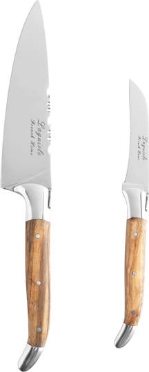 Wooden handles bring refined detail to this knife set crafted with stainless-steel blades.