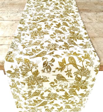 A cotton twill runner patterned with Cape sugarbirds perched on honeysuckle flowers brings fresh South African-inspired charm to your entertaining season.