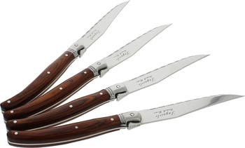 French Home's traditional and elegant Laguiole design with the iconic three Rivet curved handle and bee emblem is comfortable to hold and perfectly balanced. The steak knives have pakkawood handles and stainless steel blades that cut effortlessly. Laguiole is a town in France where this style of cutlery originated. - Set of 4 - Sharp and substantial 1.8mm serrated blade. - Fully tanged durable stainless steel - Decorated with the iconic Laguiole Bee - Hand wash recommended - Serrated blade stays sharp - Color: wood grain - Steak knife: 9.25" L x 0.75" W. Handle 4.75" length, Blade 4.5" length - Box 10" x 5" x 2" - Imported