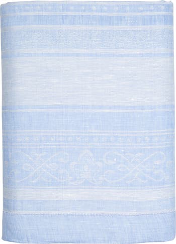 Enhance your dining room décor with French Home’s luxurious 71’’ x 71’’ Astra 100% woven linen tablecloths made in Portugal. The clean and graceful lines of the Astra tablecloth give way to an enchanting renaissance fairytale design in dreamy and romantic shades of ivory and pale blue that are showcased spectacularly by the woven jacquard fabric and is the ideal finishing touch to a beautiful table setting. When taken care of properly, these high-quality linen tablecloths can provide a lifetime of use. Steaming or ironing is required for peak smoothness and crispness after cleaning, in your washing machine or professionally.Ideal for square tables ranging from 36’’-60’’.