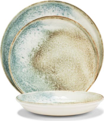 Elevate your dining experience and update your cabinets with this handcrafted dinnerware set crafted from glazed porcelain with a swirling earth-toned pattern, in shades of cream, blues, and sandy beige.