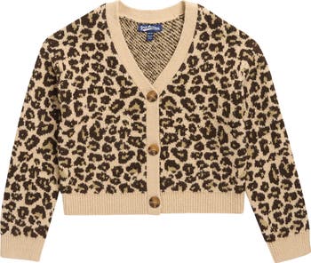 Add a dose of wild to their wardrobe with this V-neck button-front cardigan knit in a leopard-spotted pattern.