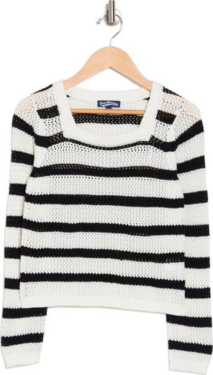 Airy open stitches bring versatile charm to a striped knit sweater designed for your kiddo.