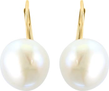A floating design gives an elegant silhouette to 14-karat-gold earrings that are anchored with glossy freshwater pearls.