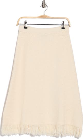 A dramatically fringed hemline brings boho texture to this waffle-knit midi skirt lightly kissed with fresh cotton yarns.