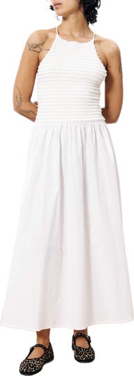 Freshen up your white dress collection with an all-cotton option designed with a strappy back and a full woven skirt.