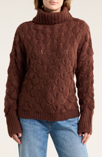 Layer on this soft open-knit pullover sweater framed by a ribbed turtleneck and slouchy sleeves for a cozy feel.