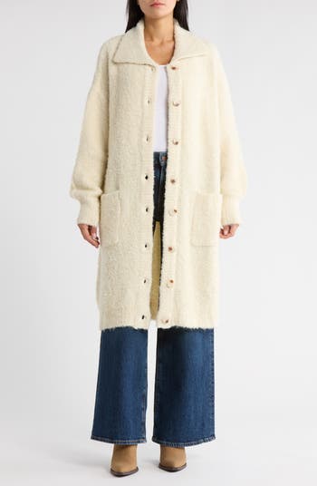 An oversized fit amplifies the ultracozy feel of this button-front cardigan knit from soft, woolly yarns and finished with handy patch pockets.