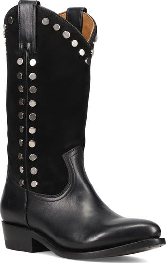 Gleaming stud hardware and a mix of suede and leather lend Western-inspired charm to a mid-calf boot balanced by a plain toe and stacked heel.