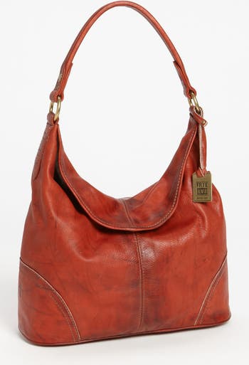Antiqued leather with a lived-in look maximizes the cool quotient of a slouchy hobo fashioned with a curved magnetic lip and O-ring strap.