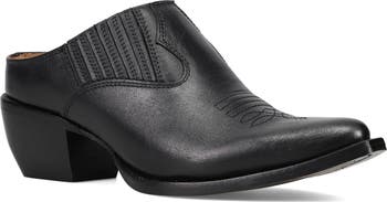 Intricate stitching and decorative seams add Western elements to a cushioned leather mule balanced by a pointy toe and stacked block heel.