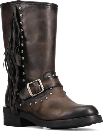 Dramatic fringe and burnished studs frame this soft leather pull-on boot grounded by a Goodyear-stitched welt and a durable grip sole.