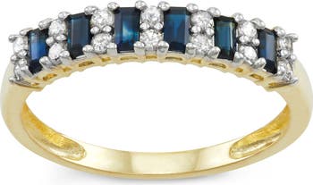 Eye-catching sapphire are interspersed by dainty round-cut diamonds on this polished band ring that's shaped from 10-karat gold.