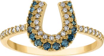 Luck into compliments galore whenever you wear this simple, sparkling 10-karat-gold ring centered by a horseshoe setting filled and framed by 28 white and 16 blue round-cut diamonds.