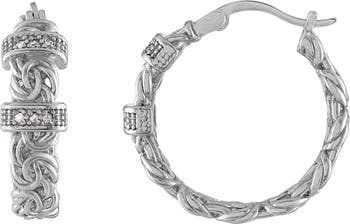 Swirled textures define huggie-hoop earrings set with round-cut diamonds for added glitz and glam.