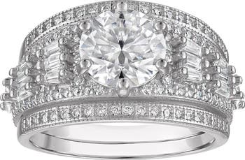 Moissanite delivers intense sparkle to a sophisticated ring crafted from sterling silver.