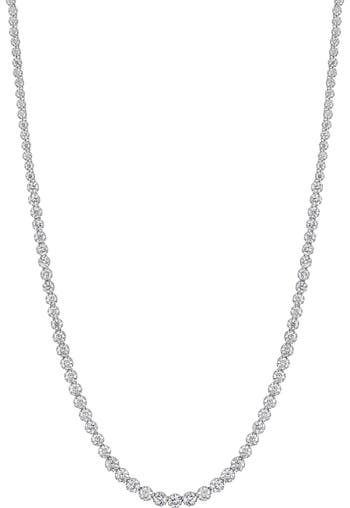 Moissanite delivers intense sparkle to a classic tennis necklace crafted from sterling silver.