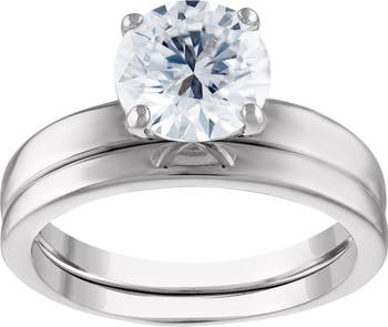 A subtle channel defines the sterling silver band of an engagement ring featuring a prong-set round-cut created moissanite solitaire.