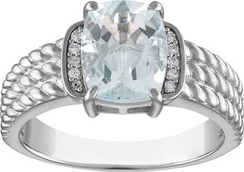 Side accents of round-cut diamonds further the shine of this polished sterling silver ring centered with a cushion-cut aquamarine stone.