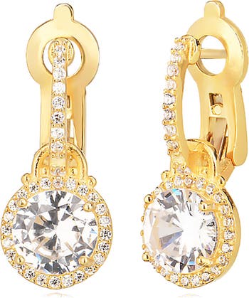 Cubic-zirconia crystals add shine to 14-karat gold-plated earrings with circular drops for extra intrigue.