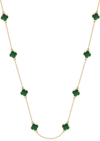Glossy slices of natural stones or shells adorn the clover stations of a delicate 14k gold-plated sterling silver choker necklace for sweet retro style.
