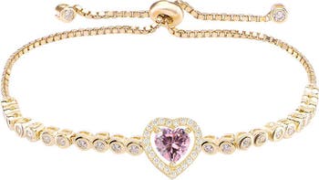 A purple CZ heart centers a 14k gold plated sterling silver CZ tennis bracelet for romantic sparkle.