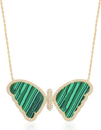 14K Yellow Gold Plated Sterling Silver Pave CZ & Malachite Butterfly Pendant Necklace