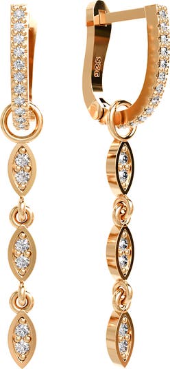 Twinkling crystal detail the swing chain that drops from J-curve huggie hoop earrings crafted from gleaming 14-karat gold to bring an elegant finish to even your most casual outfits.