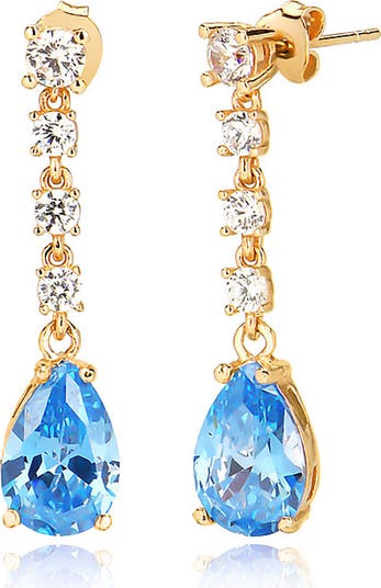 Sparkling 14-karat gold-plated sterling silver linear earrings showcase round cubic zirconia and pear-cut blue topaz drops for a pretty pop of color.