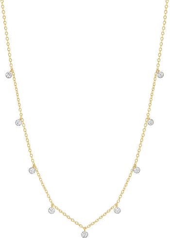 A delicate chain necklace plated in warm 18-karat gold suspends a number of shaker charms centered by bezel-set cubic zirconia.