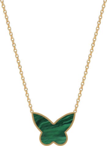 Bring a touch of whimsy to your everyday attire when you adorn your neck with this butterfly-shaped pendant centered by a striking malachite stone.