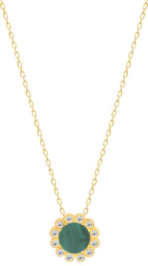 A stunning green malachite centers a pendant necklace with a halo of pavé crystals for added shine.