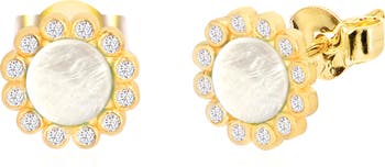 Pavé cubic zirconia acts as a halo on stud earrings centered by mother of pearl for added shine.