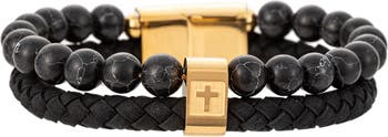 Layer your look with this braided leather and beaded double strand bracelet that is centered with a cross charm.
