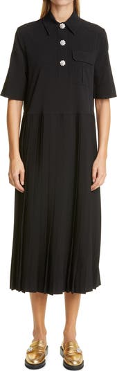 Bejeweled floral buttons beautify the polo bodice of this suiting-fabric dress that fits easy through the waist and the fully pleated midi skirt.
