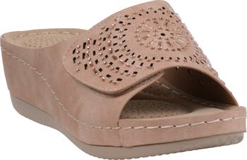 Elevate your warm-weather ensembles with this platform slide sandal detailed with laser-cutting and crystal embellishments.