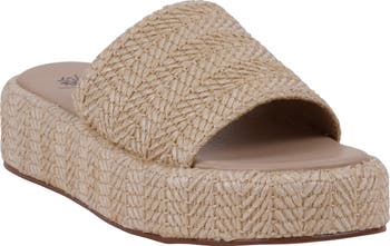 Woven faux raffia adds to the summery vibe of this slide sandal boosted on a platform sole.
