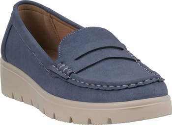 A moc-stitched toe elevates a timeless penny loafer grounded by a modest wedge heel and toothy lug sole.