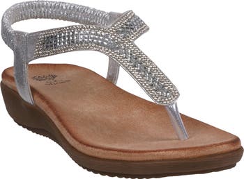 Shimmering rhinestones sparkle against the slender T-strap of a slingback sandal outfitted with a cushy footbed and low wedge heel for all-day comfort.